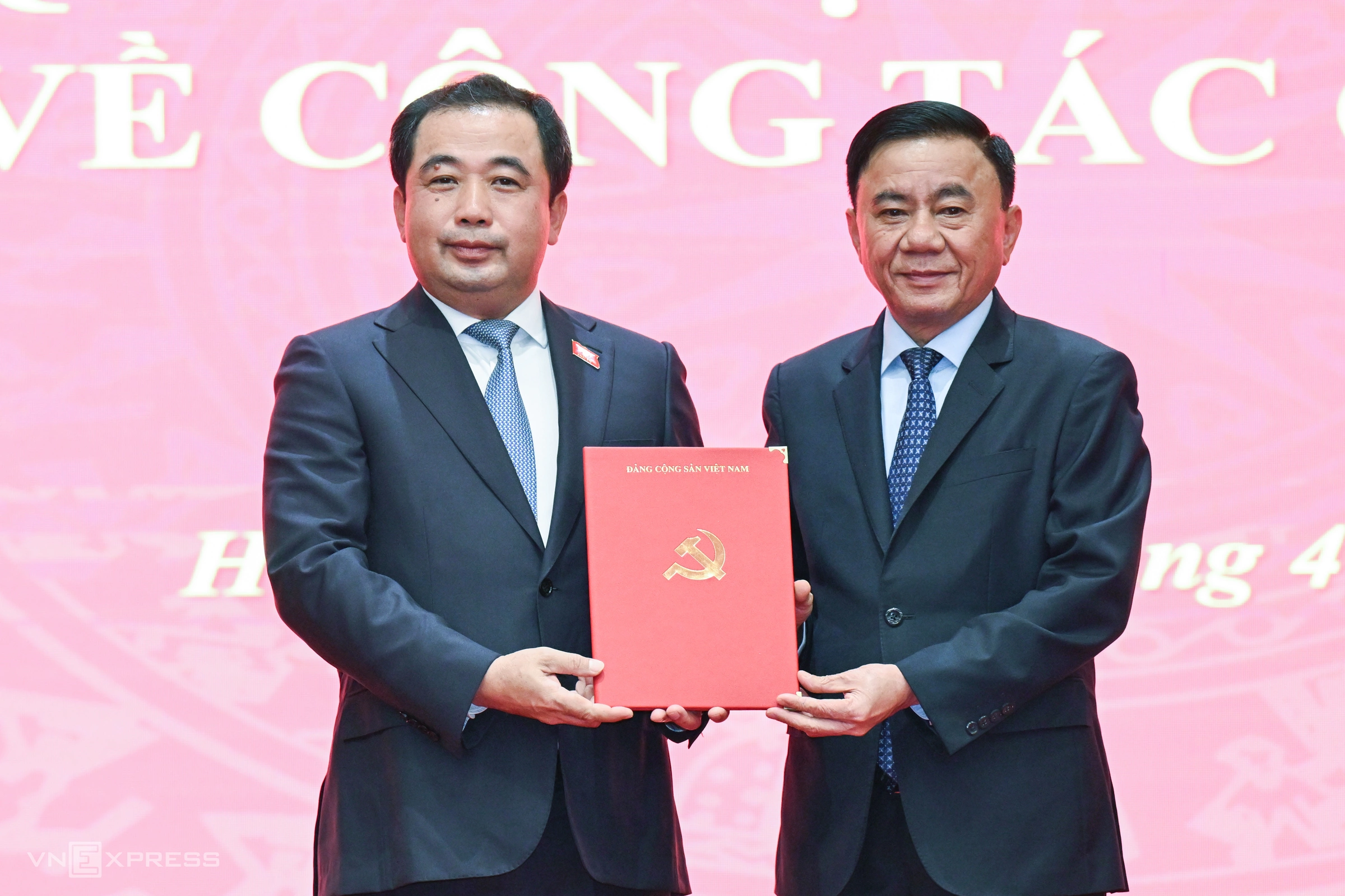 Thường trực Ban Bí thư Trần Cẩm Tú (phải) trao quyết định của Bộ Chính trị cho ông Trần Đức Thắng. Ảnh: Giang Huy