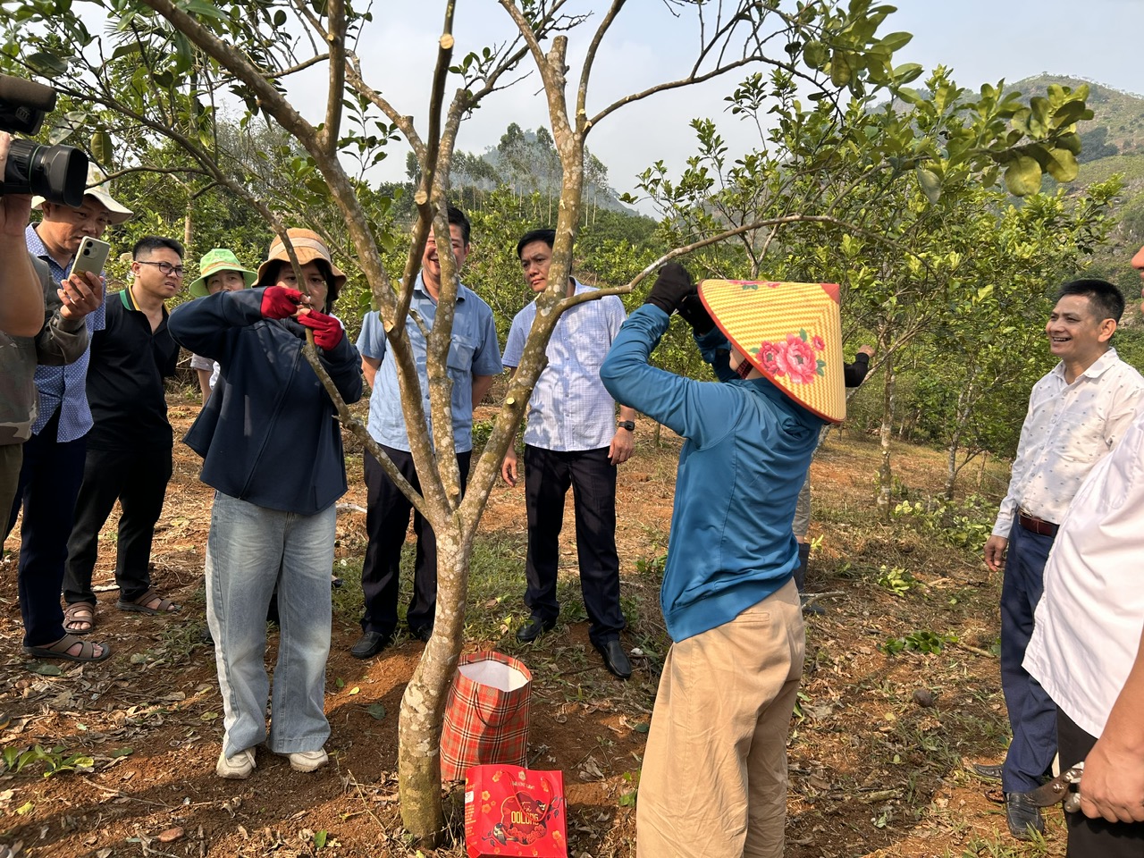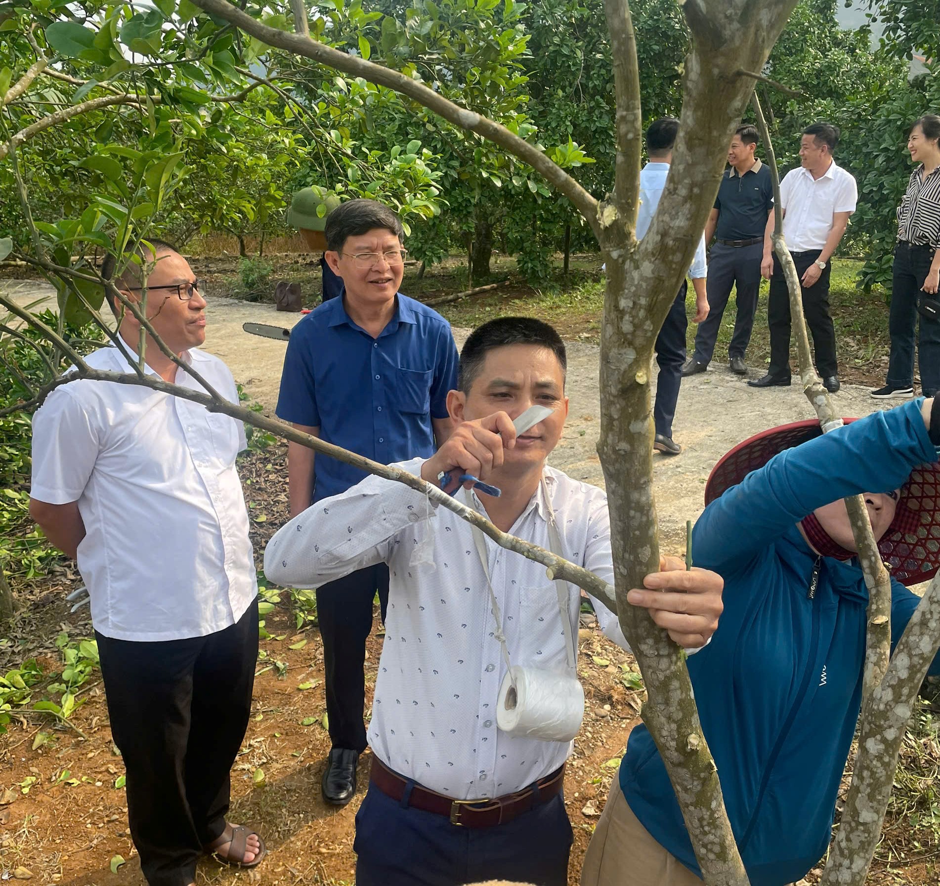 Đoàn công tác hướng dẫn kỹ thuật ghép giống Cam rốn lồi tại hộ ông Bùi Văn Lộc, thôn Minh Khai, xã Lực Hành